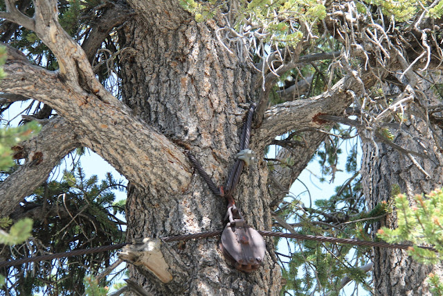 Further uphill was the attachment point, the cable running around the base of a bristlecone. It's been there so long the cable is part of the tree now. I feel a little bad for the tree.