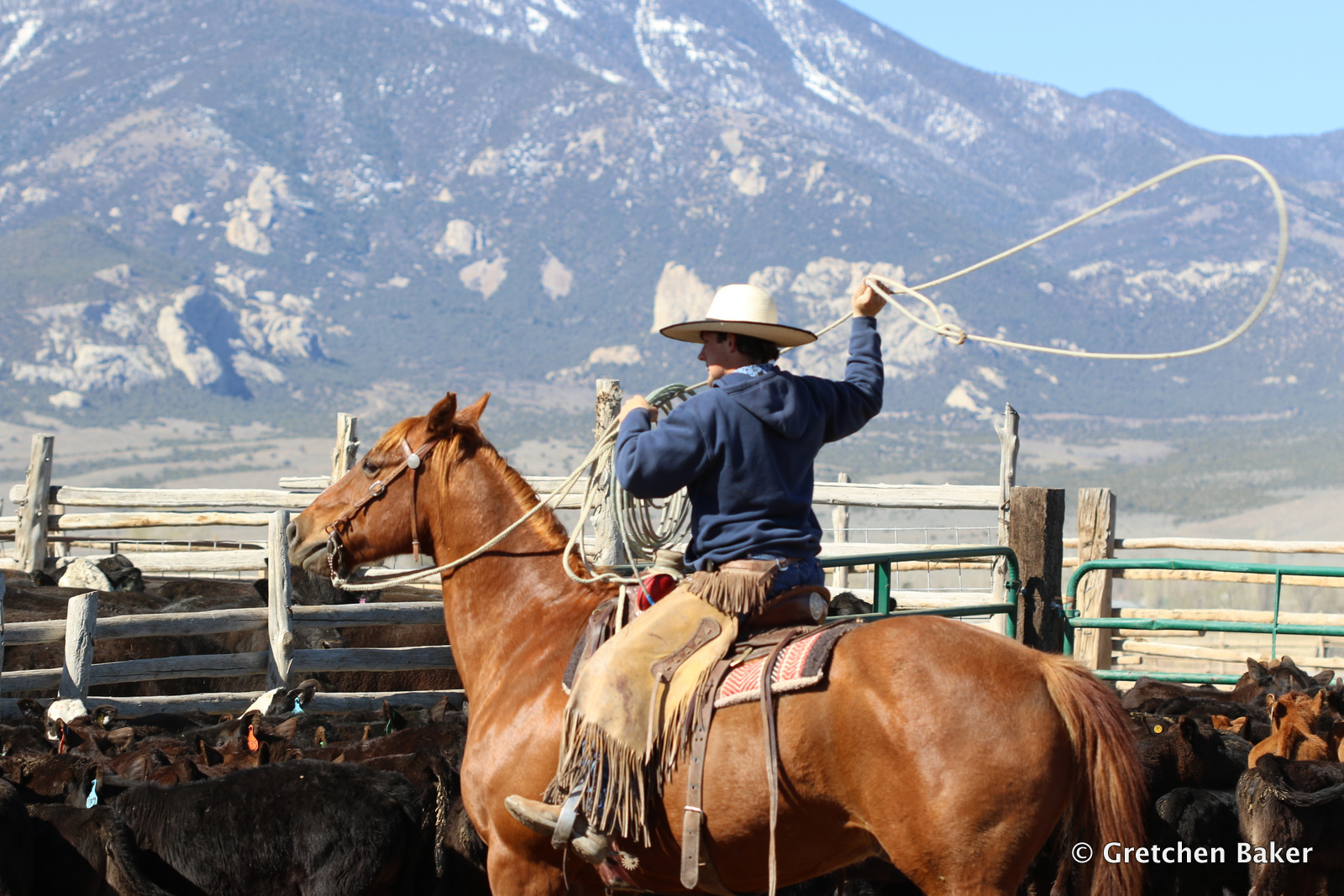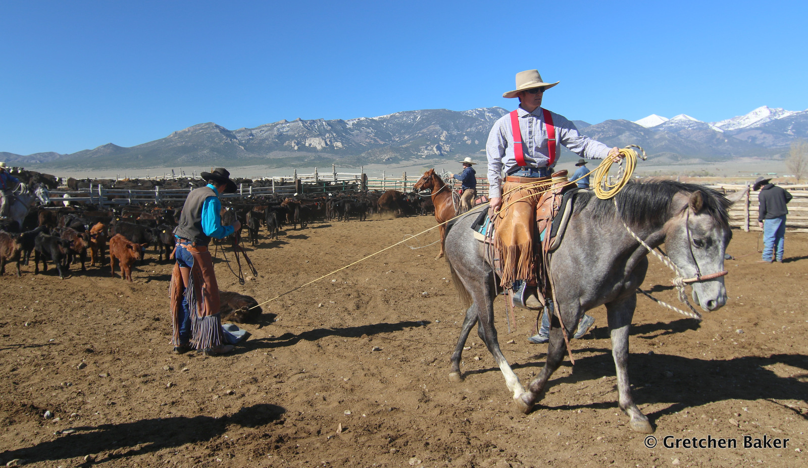 The horses are well trained to move just when told and also to stay still while the calf is being processed.