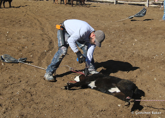 Once the calf is in position, it receives its vaccinations, an ear tag that has pesticide on it to keep the fleas away, ears cut (instead of actual branding with a hot iron), a rubber band around delicate parts if it's a male to keep it from becoming a bull, and a mark on the forehead to indicate that it's done.