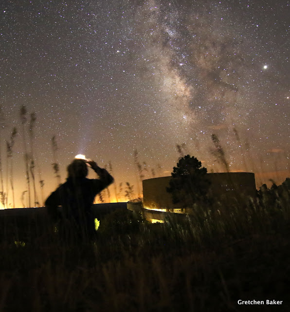 I wanted to do some night sky photography in the park, but all the cultural sites are closed at sunset, so we made do with getting a photo of the kiva-like old visitor center, with Desert Girl looking up to the sky.