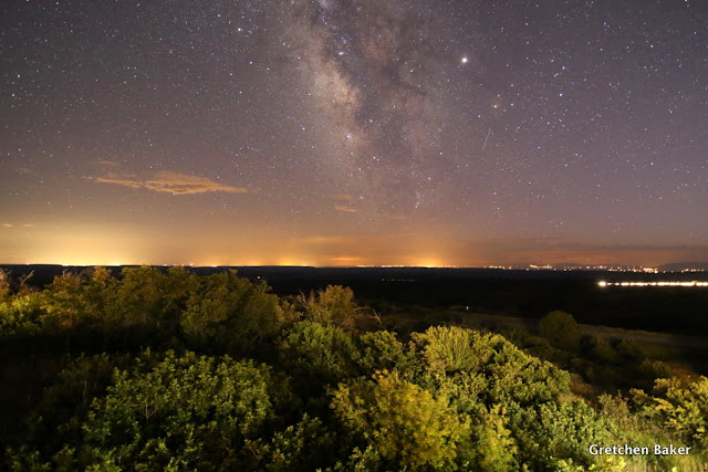 We were a few days past the new moon, so a crescent moon was hanging out to the west. Desert Girl and I went out on the balcony and watched Jupiter and Saturn appear. Then we saw Antares, the red star in the constellation Scorpius. And not long after, we could make out the asterism the Teapot just to the east, pouring out the milk into the Milky Way. I tried a Milky Way shot from the railing and found there was a lot of light pollution.