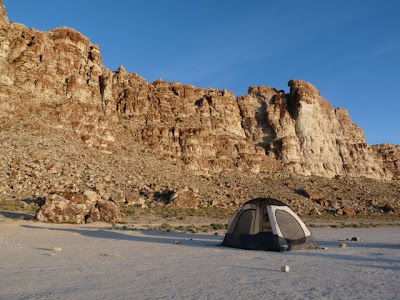 We set up our tent on the hard pan (aka playa) that is near the base of the cliffs. The hard pan provides a nearly perfectly level sleeping platform, albeit a little hard.We also watched a guy practice golf. We had never thought of golfing on a hard pan, but I guess you wouldn't lose many balls.
