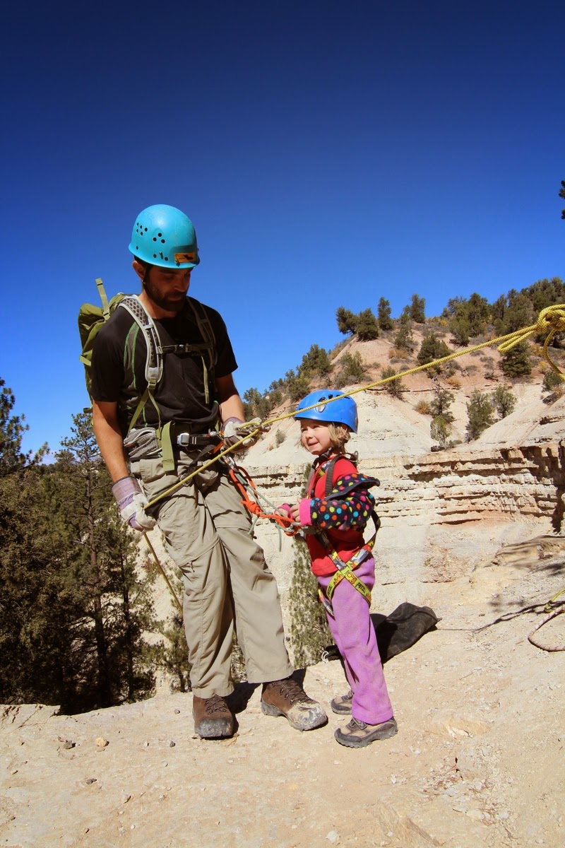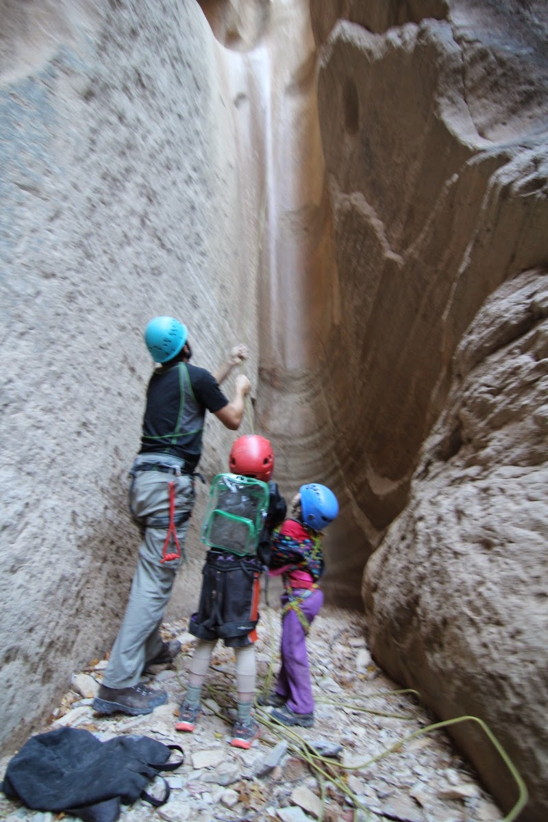 It wasn't too long until we got to our next rappel, about 20 feet. It was time for Desert Boy to learn how to rappel. He was very excited. We explained how to rappel and that if he had any trouble he just needed to call out and his bottom belay would stop him. We all got down relatively quickly and were feeling comfortable with rappelling.