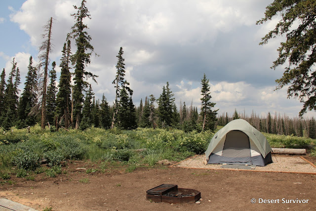 Following our rained-out Fourth of July, I took the kids to Cedar Breaks National Monument. With a 40% chance of thunderstorms I was mostly expecting to wimp out and spend the night in Cedar City, but when we got up to Cedar Breaks, it was beautiful so we set up our tent. We nabbed one of the last pretty sites in the campground (the campground has a mixed bag of campsites, including 10 that can be reserved in advance, but all of them had been taken when I had looked a few days before).