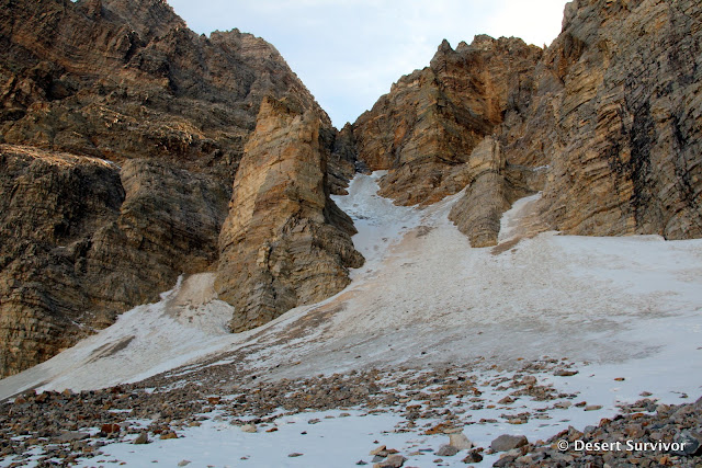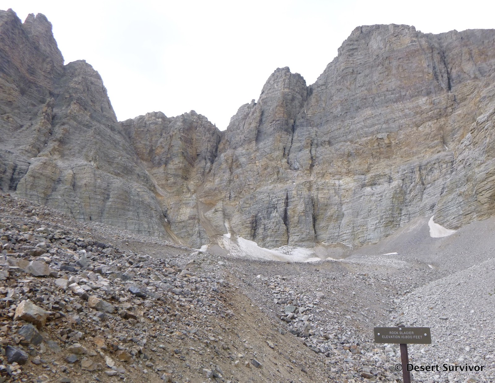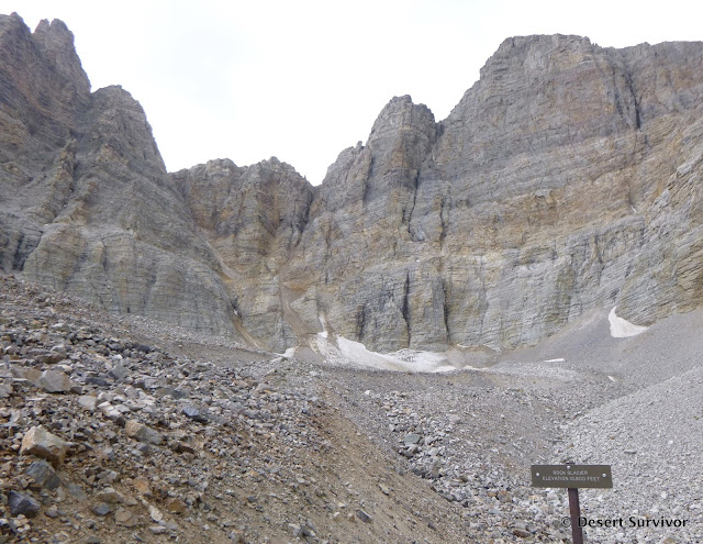The third condition, the size, is the one I'm not convinced is met. It's hard to tell because so much of the ice is covered with falling debris, so it's hard to determine what's ice and what's rock. According to Gerald Osborn and Ken Bevis in their 2001 article "Glaciation in the Great Basin of the Western United States," a glacier exists, so until a scientific article proves otherwise, I'm going with it. This makes this glacier the only one in Nevada. Who knew Nevada had a glacier?