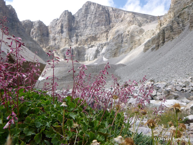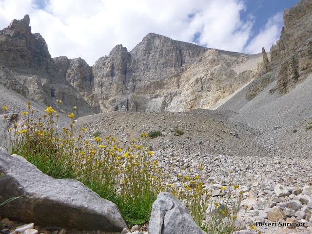 It's such a different looking world being in the cirque. On three sides are mountain walls over a thousand feet higher, and the steep cliff face of Wheeler Peak rises over 2,000 feet from the cirque. It's so barren looking, with so much grey rock. But the many flowers definitely brighten up the place for a month or two each summer.