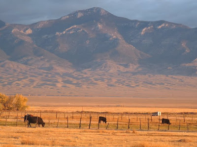 Here are some of our neighbor's cows, with the mountain range to the north in the background. Early morning light really highlights how rough the foothills are.