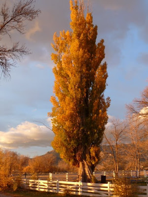The Lombardy poplar's almost vertical branches catch a lot of the leaves as they fall off. During the winter some birds will nestle into the tree, using the leaves as insulation to help keep warm. When I walk by them, the birds fly off and I feel a little bad about disturbing them.