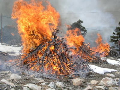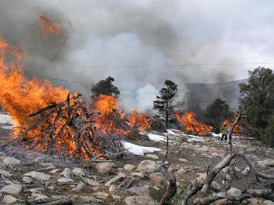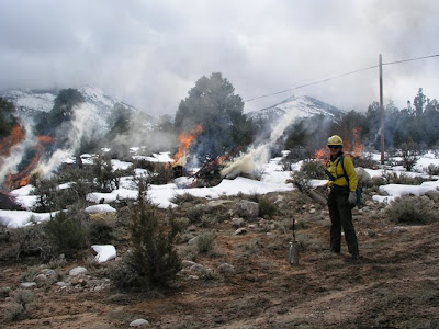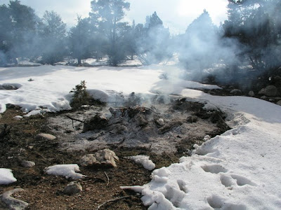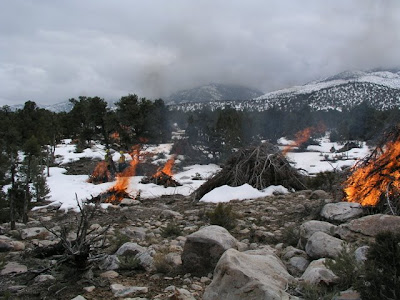 Eventually the fire reduces the piles of wood to piles of ash surrounded by slightly melted snow. The next summer, the gaps in the forest will help slow or stop a wildland fire if it happens to occur there. If you're interested in learning more about wildland fire, check out the National Interagency Fire Center website.