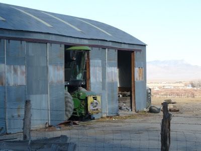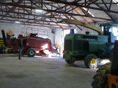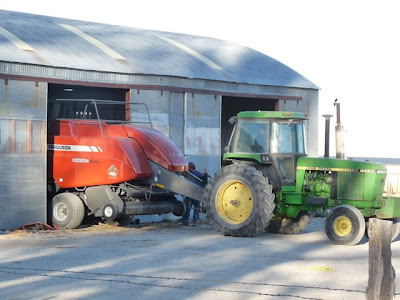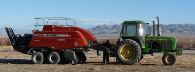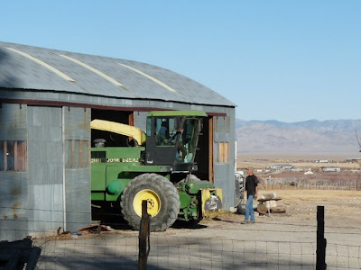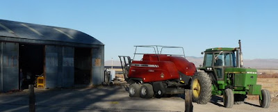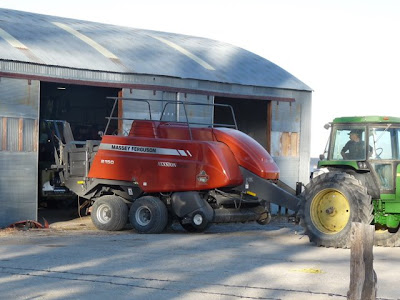 In order to prepare for winter, yesterday two ranch hands were busy getting some of the equipment inside. This is a Massey Ferguson 2150 baler. It won't be out in an alfalfa field until next June.