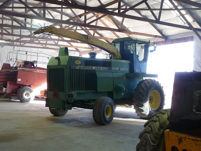 Next up is the big chopper, a John Deere 6910. This is one of Desert Boy's favorite pieces of farm equipment because it has a tall ladder to climb to reach the cab. The chopper is really big--and really tall.