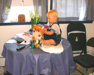 I walked into the kitchen the other day to behold this troubling sight: Desert Boy had clambered up on the kitchen table, sat squarely on his tray, and was about to dump a box of cereal on the floor. Yeehaw, what a good time (if you're Desert Boy!).  As you can see, he doesn't pay any attention to me.