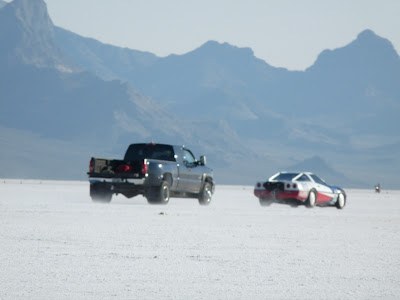 After watching so many neat cars and motorcycles go zooming away across that smooth salt trying to go as fast as possible, trying to break the record for their class, it was our turn to go out on the salt. No, we weren't racing (although I'm sure my husband had several thoughts about it). Instead, we had permission to go visit the main timing tower, which is located between the long and short course at mile marker three. It was neat driving out on the salt and have vehicles zooming past us at much faster speeds.