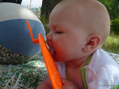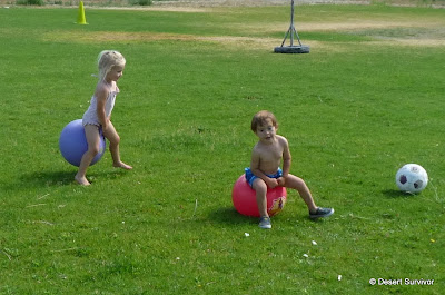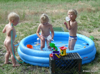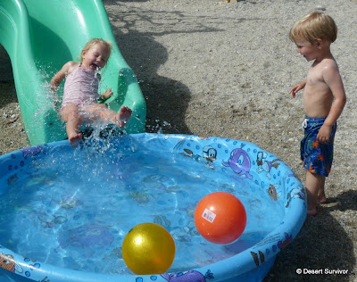And then it was finally time--time to get wet! The kids stripped down. Desert Boy happily did that all by himself, and to my great surprise kept on his underwear (backwards, of course). He likes to run around sans clothing at home at times, but he has been very proud that he's a Big Boy and wears underwear now, and that might be why he kept it on. He tells me at least once a day, "I'm a Big Boy and I wear underwear." I smile and nod and agree heartily. This is something we'll be happy to go along with.