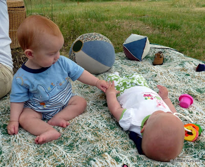 Isaac and Emma hung out together on the soft blanket. Isaac has mastered sitting and is really good at grabbing what he's reaching for.