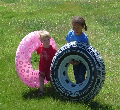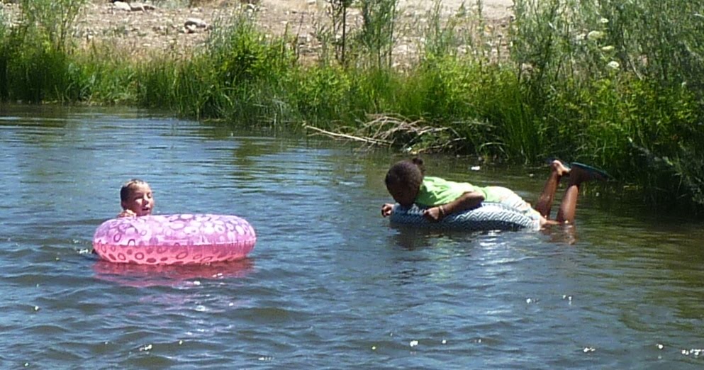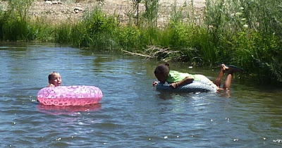 After some rest and recuperation and lunch, it was time to relax in one of our favorite activities--playing in water! Desert Boy and Lola carried innertubes over to the nearby swimming hole.