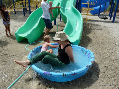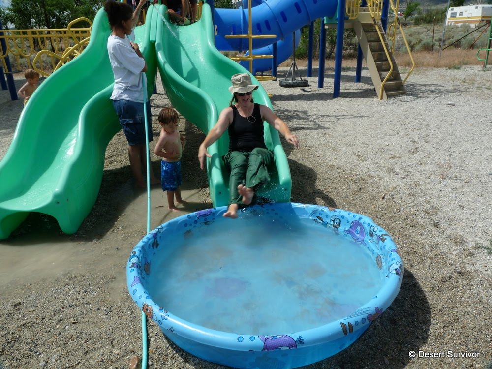 And it was quite some action. Jenny had brought a swimming pool and put it under the slide. We filled it up, and presto, we had a water slide! It was a hot day, perfect for a water slide. Desert Boy went splash.