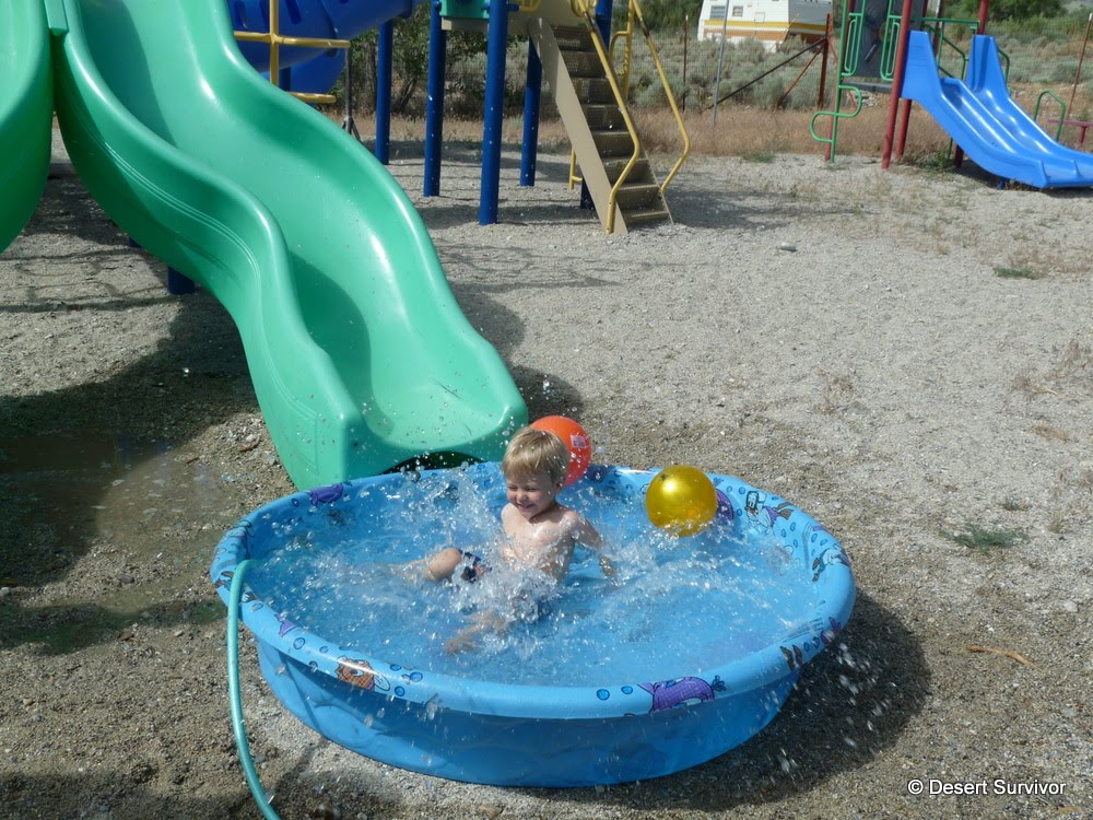 Besides a deluxe playground under some nice shade trees, the park also had a fountain feature, and Desert Boy enjoyed running around in it.