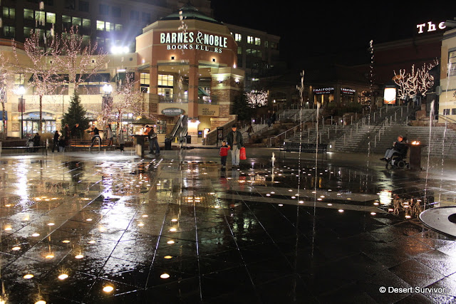 Afterwards we checked out the Christmas lights in the Gateway Center. We were fascinated by a fountain. During the summer it would be a wonderful place to cool off. In the winter it looked cold. But my husband found a way to walk through without getting (too) wet, so he and Desert Boy took a walk on the wild side.