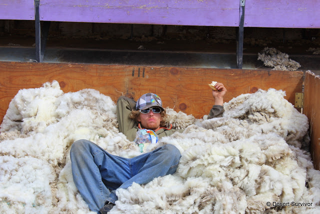 We found Morgan, our wonderful hostess from the day before, and she led us into the sheep shearing trailer. Desert Boy was a little intimidated at first by all the noise, mostly from the generator and electric motors used to power the clippers.