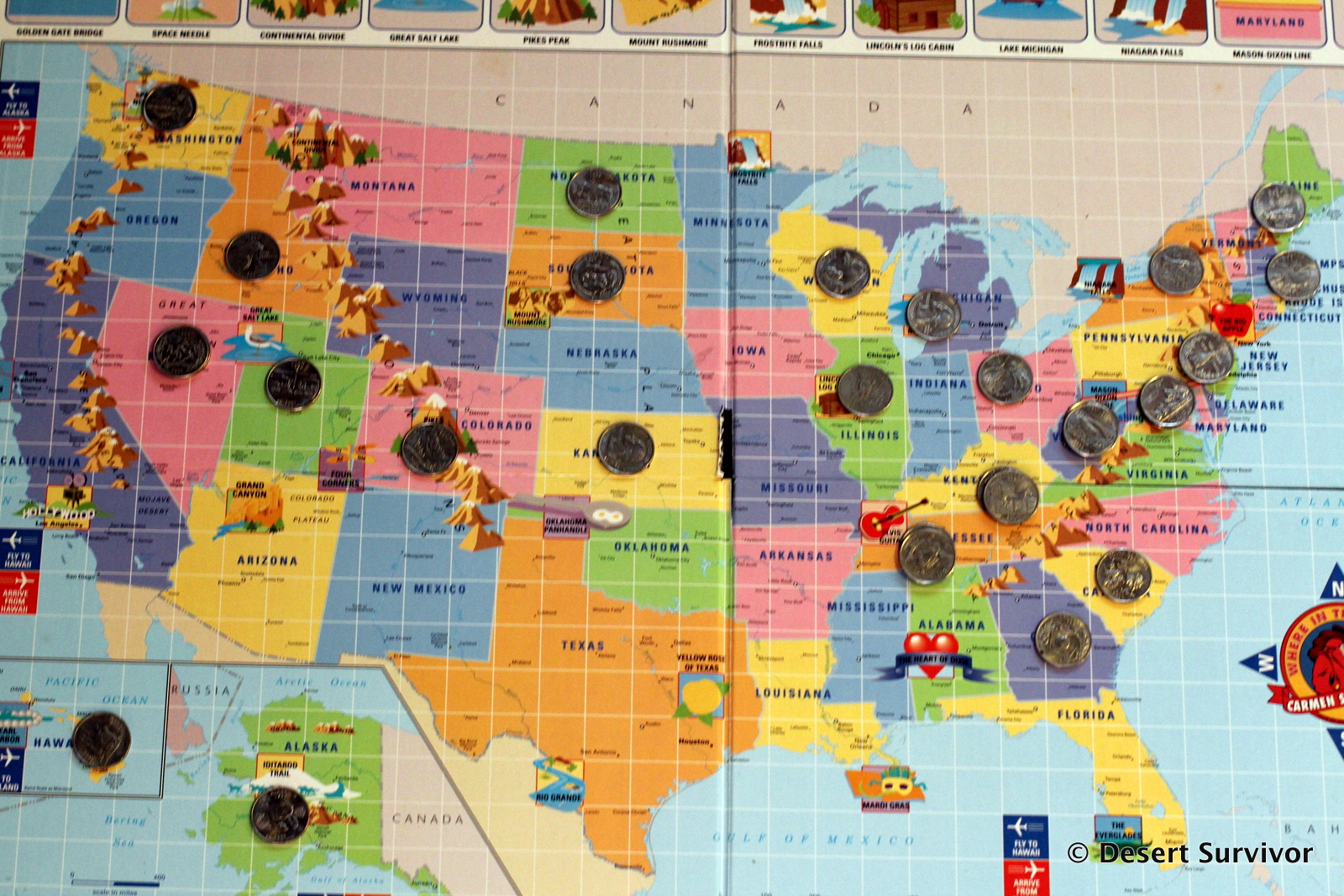 Then Desert Boy started looking at the quarters and finding where they belonged. We used our game board from Where in the USA is Carmen Sandiego (a wonderful thrift store find at $1!), but any large USA map would do.