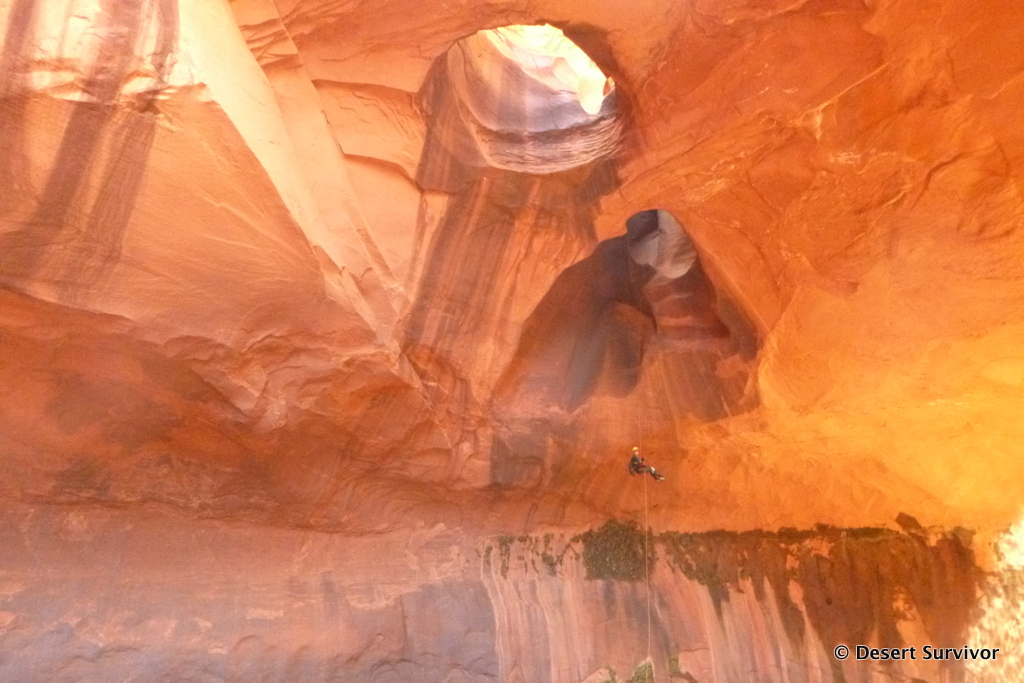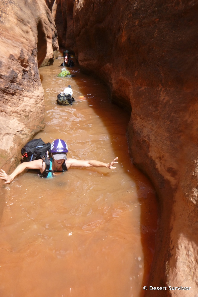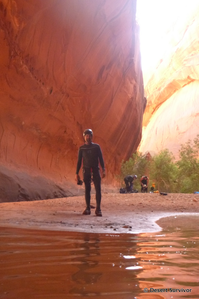 After a quick rappel into a side canyon we entered the main canyon, which was only a few feet wide. A swimmer hole soon followed, and about half the group put on wetsuits. The rest of us were so hot from hiking we decided to give the pools a try in just our shorts and t-shirts.