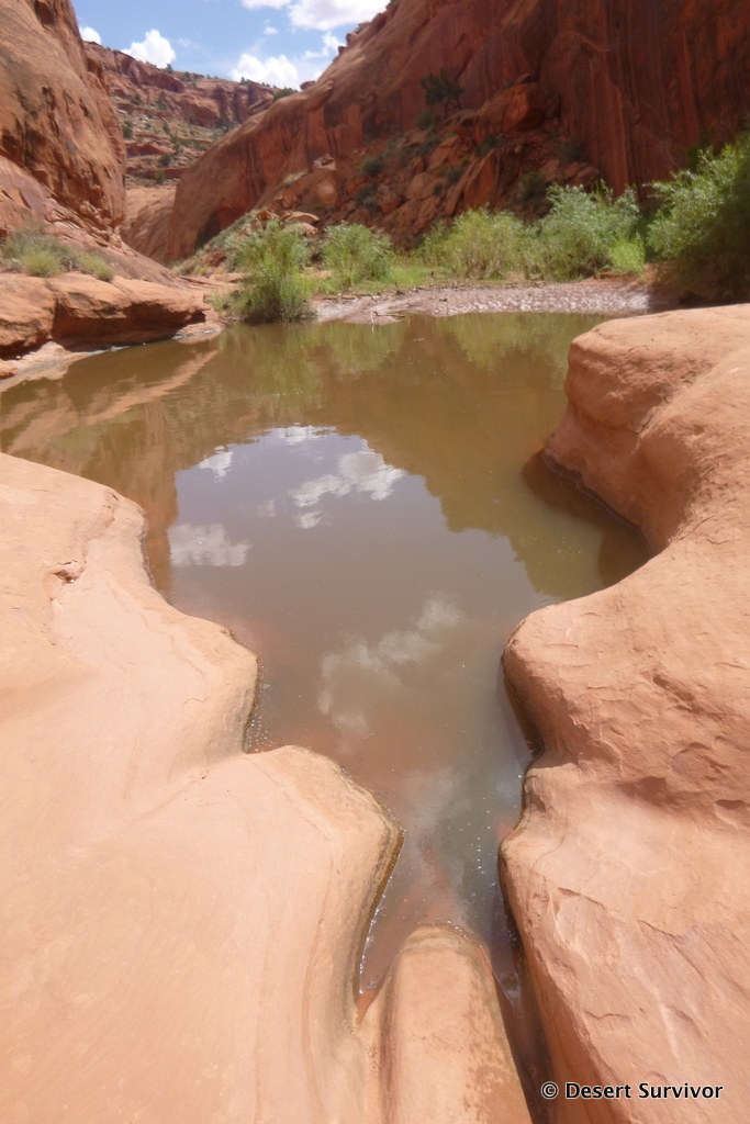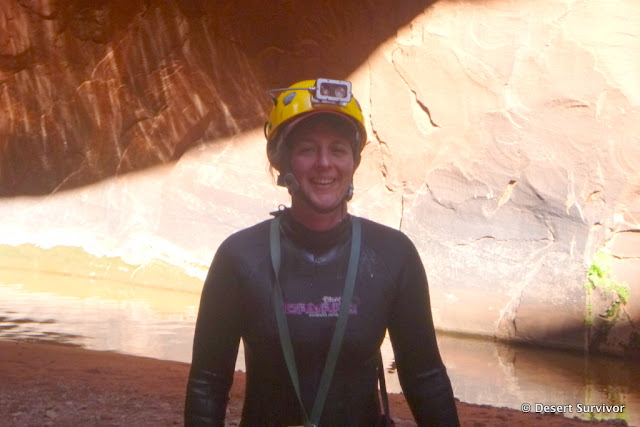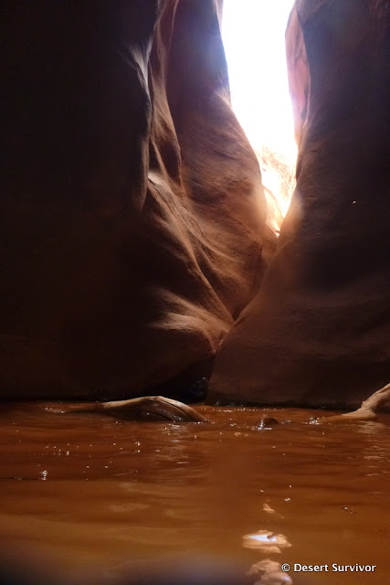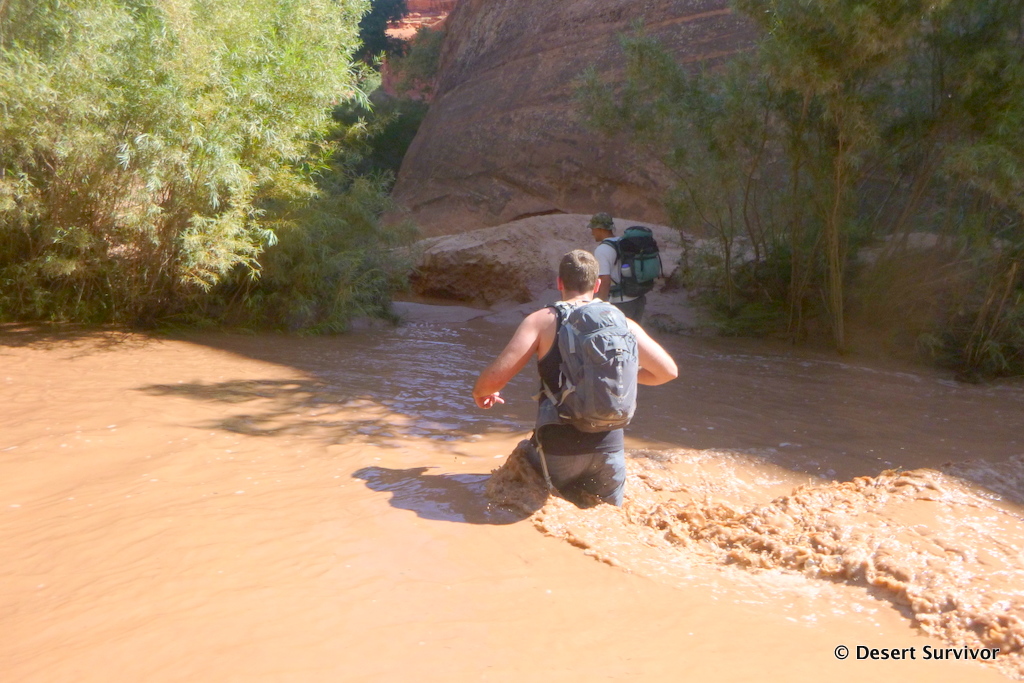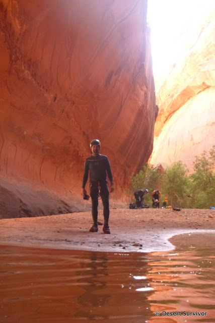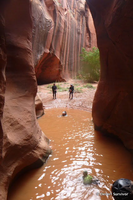 The Escalante River wasn't quite what I expected. The entire streambed is really wide, and we first crossed a dry section of it. We could hear water, so we knew the stream was close, and after bushwhacking through willows reached it. The water was running fast and brown from the recent rains, and was over knee high crossing it. Small branches floated down, and I felt the river trying to push me over as I crossed. But that wasn't enough to prevent a few of us taking a small trail upstream and jumping in and floating to the canyon entrance. It felt great to cool off!