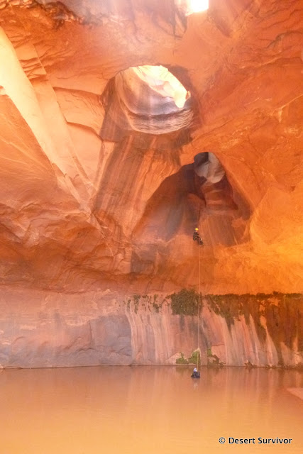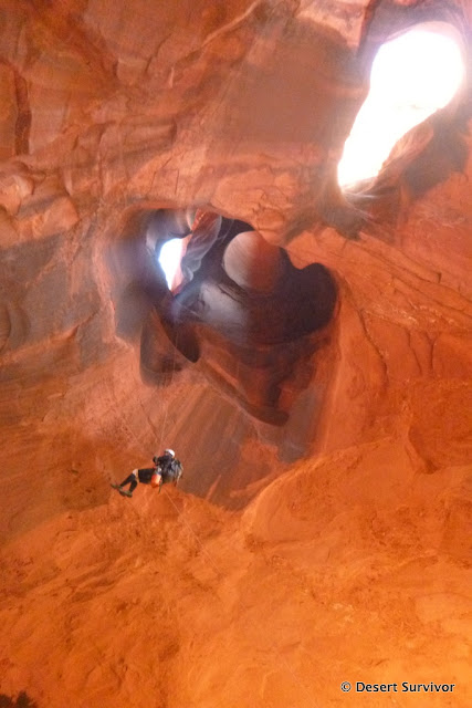 We went right over what is usually another keeper pothole and then got ready for the final rappel--into the magical Golden Cathedral. Thanks to Bryan for catching this photo of me.