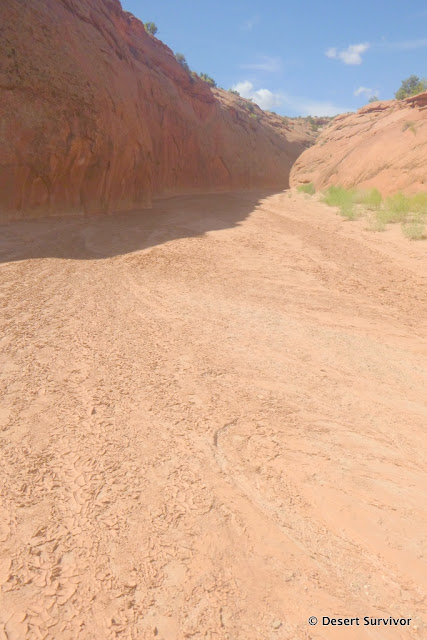 After a climbdown through some boulders and more squirming through even tighter passage, I emerged and headed right (north) back into the Dry Fork Wash. The walls were higher, providing some pleasant shade. If I had had more time, I could have gone down canyon 30 minutes to explore Brimstone Canyon, but I felt home calling me, so I headed in the direction of the trailhead.