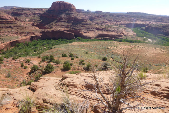 We started hiking in Grand Staircase-Escalante National Monument and crossed an unmarked boundary into Glen Canyon National Recreation Area. Eventually we got to where we could see the green swath of the Escalante River. What a welcoming sight! As we got close to our butte, we could see the canyon below it, meeting up with the Escalante.