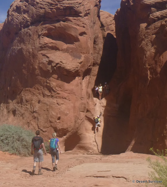 We ate an early lunch and then started up the canyon, quickly hiking out of the canyon bottom. The view up canyon was spectacular. We followed a well-marked trail past the first possible drop-in place. At the second (the "more fun entrance"), we decided it was time to go into the canyon. It's possible to go much farther up canyon before dropping in, but the most spectacular part is the bottom part and we were doing a daytrip, so we decided this was a good place for us. Plus it was hot, and we were eager to get into the shade of the canyon.