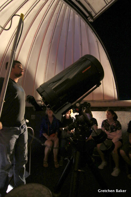 Our big group (about 25) was split into two, and we joined the first group into the observatory, which sits about 12. Our guide then showed us some wonders of the night sky with the 14-inch Celestron telescope. I loved the rotating roof! We saw Jupiter, Saturn, the ring nebula, and a globular star cluster. He said that on nights with fewer people, they see more objects. I didn't mention to him that at Saturday night's astronomy program at Great Basin National Park, 200 people showed up and the lines at the telescope were really long!